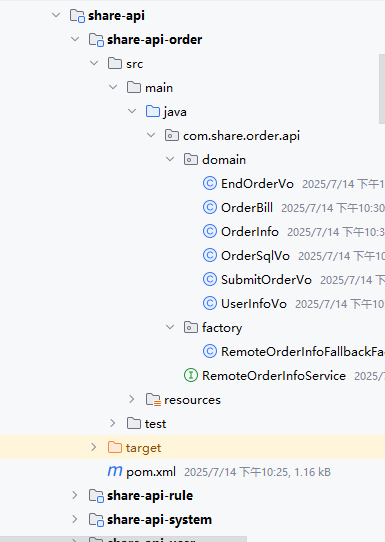 share-api下:share-api-order→ 订单相关的 API 接口share-api-rule→ 规则服务的 API 接口share-api-system→ 系统服务的 API 接口share-api-user→ 用户服务的 API 接口