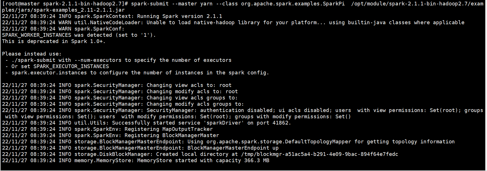 spark-submit --master yarn --class org.apache.spark.examples.SparkPi $SPARK_HOME/examples/jars/spark-examples_2.11-2.1.1.jar