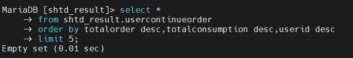 由以上查询结果可知,由于提供的样例数据问题,基于该样例数据并没有找到连续两日下单的用户(不是何种原因比赛时也依旧没有找到数据)。