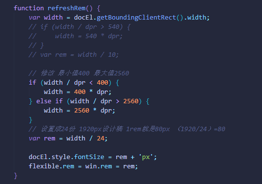 在项目开发过程中,我学习并应用了rem作为我的响应式布局技术,rem是相对于根元素(html)字体大小的单位,它的值可以根据元素的字体大小而相对的调整,从而实现页面的自适应布局。由于大数据图表是宽屏项目,所以在项目中我主要修改了rem配置文件的默认分辨率